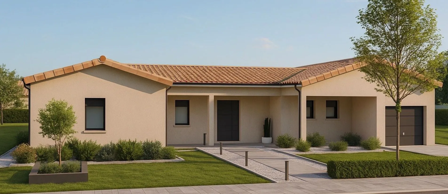 Découvrez notre maison sur-mesure à Pranzac (16), un modèle de plain-pied de 150,44 m² alliant charme traditionnel et confort moderne. Cette construction sur-mesure offre 4 chambres agréables ainsi qu’un atelier de 15 m². Ce projet sur-mesure illustre pleinement notre expertise de constructeur de maisons neuves en Charente.